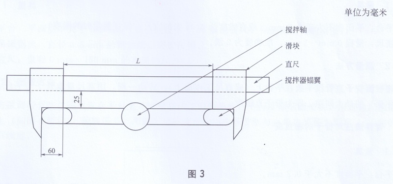 將待測(cè)攪拌器放平,如圖3所示,將直尺的兩個(gè)滑塊卡在攪拌器的兩個(gè)錨翼上,在直尺上讀出滑塊兩端的長(zhǎng)度L,則攪拌器錨翼寬度值為L(zhǎng)+120 mm,取3次測(cè)量的平均值與攪拌器標(biāo)準(zhǔn)寬度之差的絕對(duì)值作為攪拌器錨翼寬度與標(biāo)準(zhǔn)寬度的偏差。