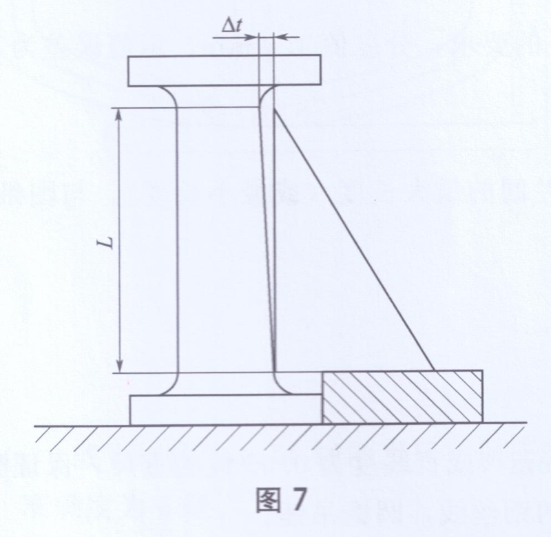 將被測塔節(jié)法蘭端放置在平臺上,在緊靠法蘭邊處墊放一平行度標(biāo)準(zhǔn)圓墊塊,用直角尺貼靠在塔節(jié)壁上(如圖7所示),繞塔節(jié)軸線旋轉(zhuǎn)平行度標(biāo)準(zhǔn)圓墊塊和直角尺,用直尺景取旋轉(zhuǎn)一周中塔節(jié)做體外壁與直角邊的最大距離△t,此值即為塔節(jié)法蘭對塔節(jié)的垂直度。